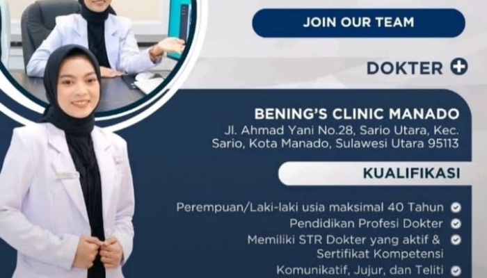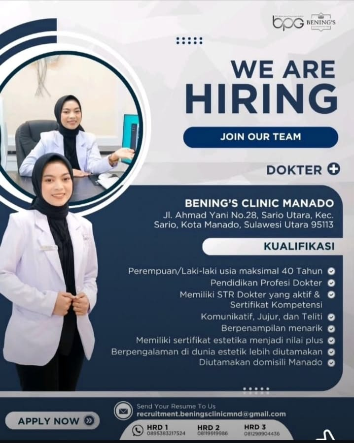 Bening’s Clinic Manado secara resmi membuka lowongan pekerjaan untuk posisi Dokter profesional. Kami mengundang para dokter yang kompeten, komunikatif, dan berdedikasi tinggi untuk bergabung dengan tim kami dalam memberikan pelayanan estetika terbaik bagi masyarakat Manado dan sekitarnya.