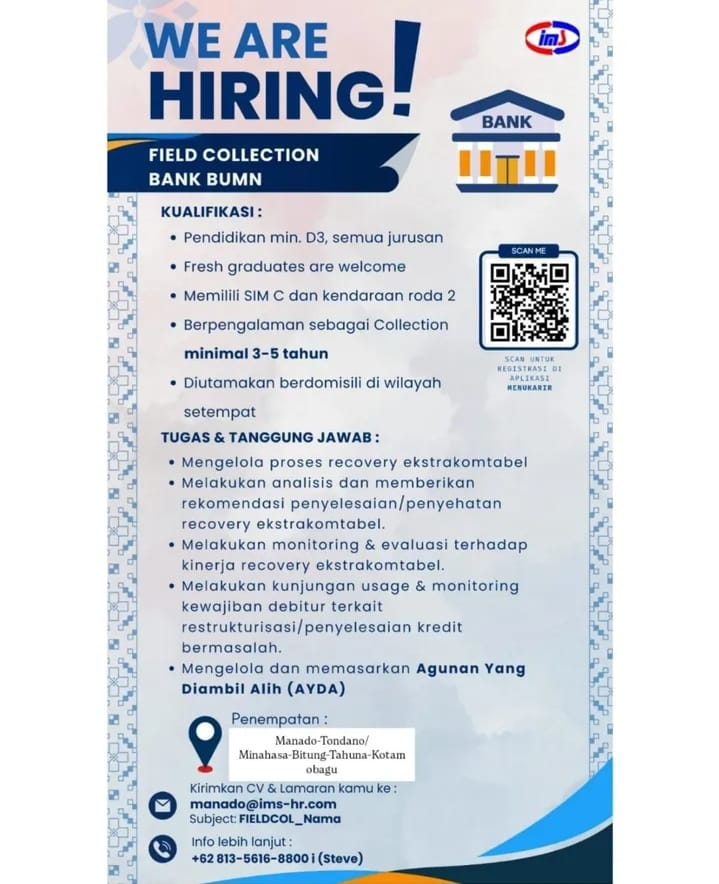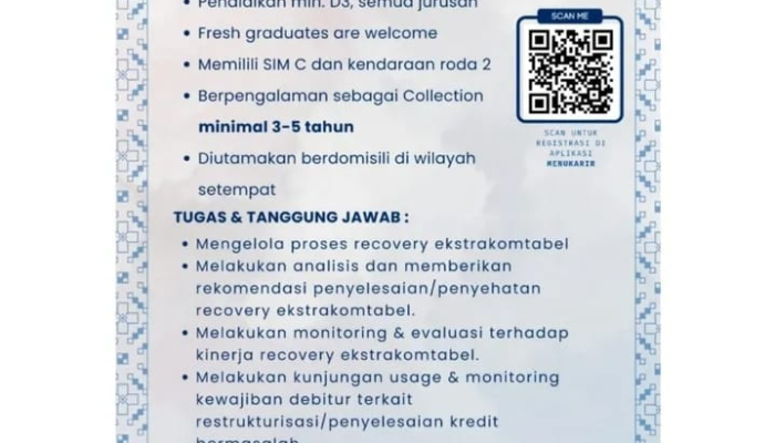Apakah Anda sedang mencari karir di sektor perbankan? Inilah kesempatan emas untuk bergabung dengan Bank BUMN sebagai Field Collection. Posisi ini cocok untuk Anda yang memiliki kendaraan roda dua, siap bekerja di lapangan, serta tertarik dengan dunia penagihan dan recovery kredit bermasalah.