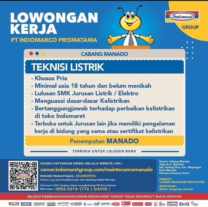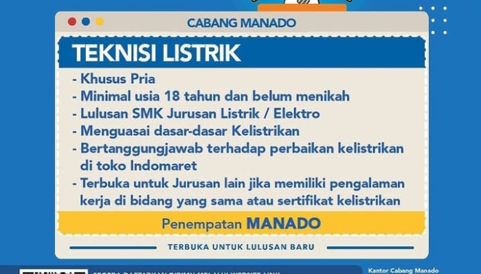 Indomaret Group melalui PT Indomarco Prismatama membuka kesempatan karir bagi lulusan SMK maupun tenaga berpengalaman untuk bergabung sebagai Teknisi Listrik. Posisi ini terbuka khusus untuk kandidat pria yang siap ditempatkan di cabang Manado.
