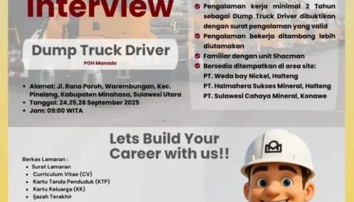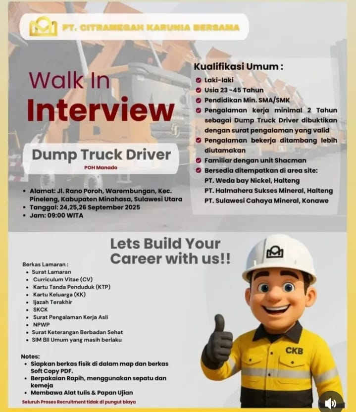 KESEMPATAN TERBATAS! Bagi Anda para driver dump truck berpengalaman di Manado dan sekitarnya, PT Citramegah Karunia Bersama (CKB) mengundang Anda untuk mengikuti WALK-IN INTERVIEW yang diselenggarakan selama tiga hari, mulai hari ini!