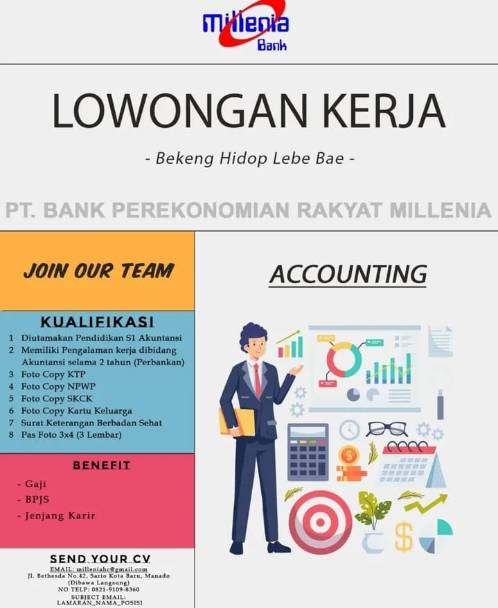 milleniabank@gmail.comdengan subjek:LAMARAN_NAMA_POSISI - Alamat: Jl. Bethesda No.42, Sario Kota Baru, Manado