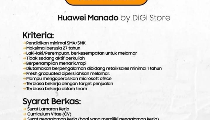 Huawei Manado by DiGi Store sedang membuka lowongan untuk posisi Sales Advisor.