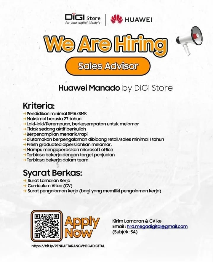Huawei Manado by DiGi Store sedang membuka lowongan untuk posisi Sales Advisor.
