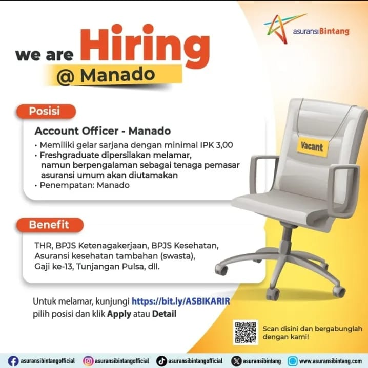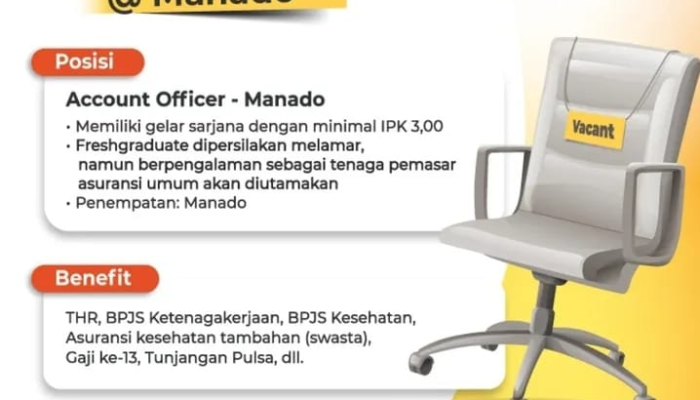 Kami secara resmi membuka lowongan pekerjaan untuk posisi Account Officer yang akan ditempatkan di kantor cabang kami di Manado. Posisi ini sangat cocok bagi Anda yang dinamis, memiliki kemampuan interpersonal yang baik, dan siap untuk tumbuh di industri asuransi umum.