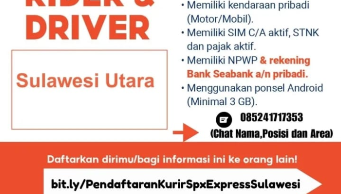 Anda sedang mencari pekerjaan di bidang logistik dan pengiriman? Punya kendaraan pribadi dan menguasai jalanan di area Sulawesi Utara? Kabar gembira untuk Anda! SPX Express (Shopee Express), salah satu jasa pengiriman e-commerce terbesar di Indonesia, membuka kesempatan besar untuk Anda bergabung sebagai mitra Rider & Driver.