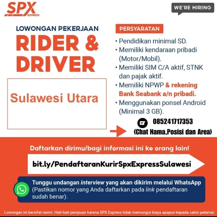 Anda sedang mencari pekerjaan di bidang logistik dan pengiriman? Punya kendaraan pribadi dan menguasai jalanan di area Sulawesi Utara? Kabar gembira untuk Anda! SPX Express (Shopee Express), salah satu jasa pengiriman e-commerce terbesar di Indonesia, membuka kesempatan besar untuk Anda bergabung sebagai mitra Rider & Driver.