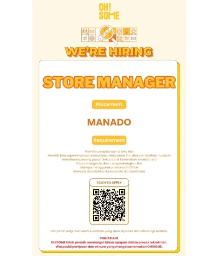 Anda seorang pemimpin berpengalaman di dunia ritel yang siap membawa sebuah toko menuju puncak kesuksesan? OH!SOME, sebuah brand ritel yang modern dan dinamis, sedang mencari seorang Store Manager (Kepala Toko) yang andal dan visioner untuk memimpin operasional toko kami di Manado.