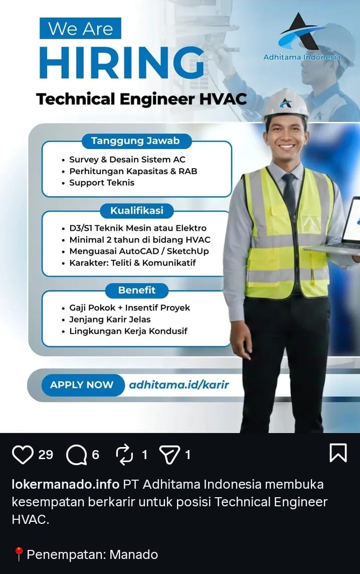 Apakah Anda seorang ahli di bidang sistem pendingin udara yang sedang mencari tantangan baru di Manado? PT Adhitama Indonesia saat ini membuka kesempatan karier bagi profesional muda yang kompeten untuk mengisi posisi sebagai Technical Engineer HVAC.