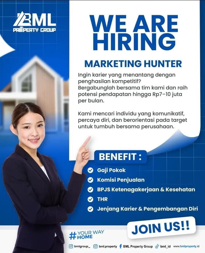 Apakah Anda seorang komunikatif yang sedang mencari tantangan karier dengan penghasilan menjanjikan? BML Property Group sedang membuka kesempatan emas bagi Anda untuk bergabung sebagai Marketing Hunter.