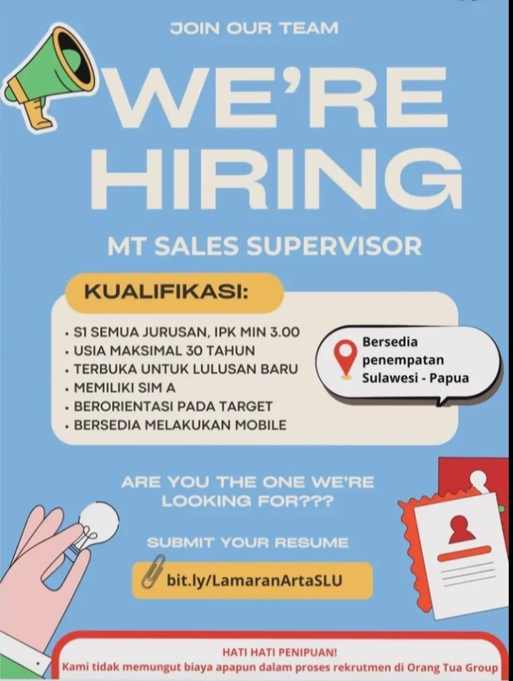Apakah Anda lulusan baru yang mencari percepatan karir di bidang sales dan distribusi? Orang Tua Group (OT Group), salah satu perusahaan consumer goods terbesar di Indonesia, sedang membuka kesempatan bagi talenta muda berbakat untuk bergabung dalam program Management Trainee (MT) Sales Supervisor.