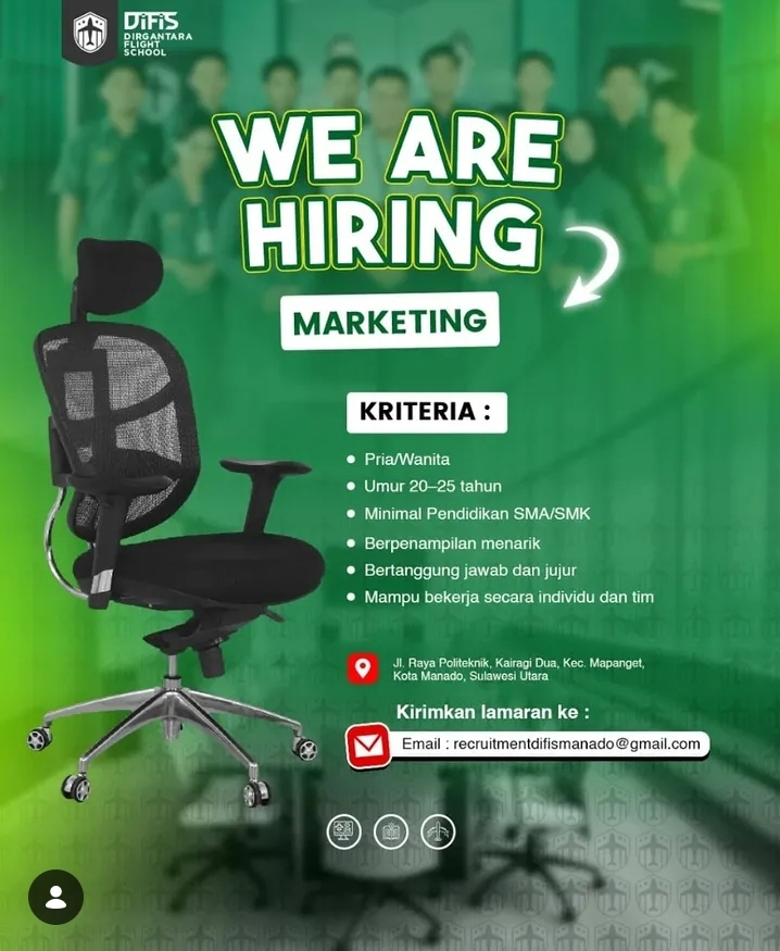 Apakah Anda jiwa muda yang enerjik, komunikatif, dan tertarik berkarir di dunia penerbangan? Dirgantara Flight School (DiFiS) Cabang Manado sedang membuka kesempatan bagi Anda untuk bergabung sebagai tenaga Marketing.