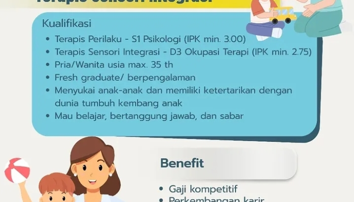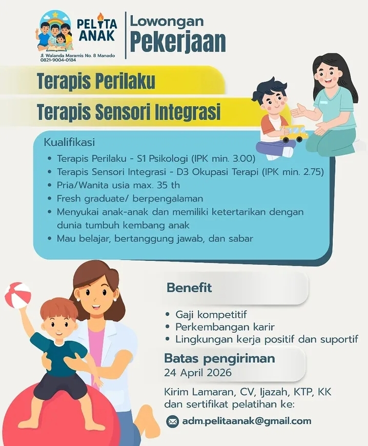 Apakah Anda memiliki minat besar dalam dunia tumbuh kembang anak? Pelita Anak, lembaga yang berfokus pada layanan anak di Manado, sedang membuka kesempatan karir bagi tenaga profesional yang sabar dan berdedikasi untuk bergabung sebagai tim terapis.