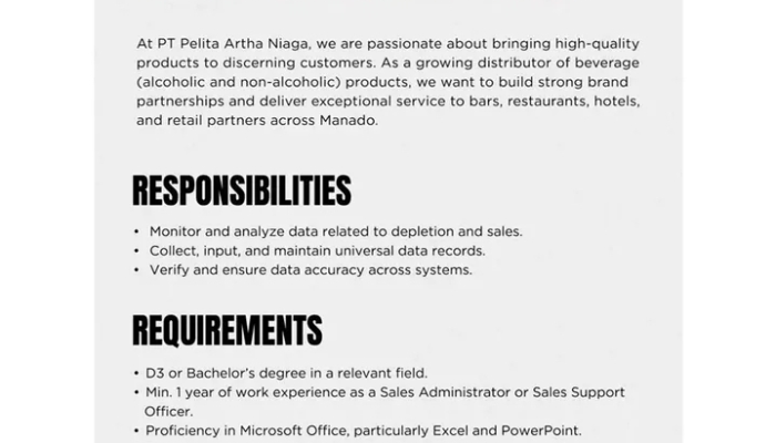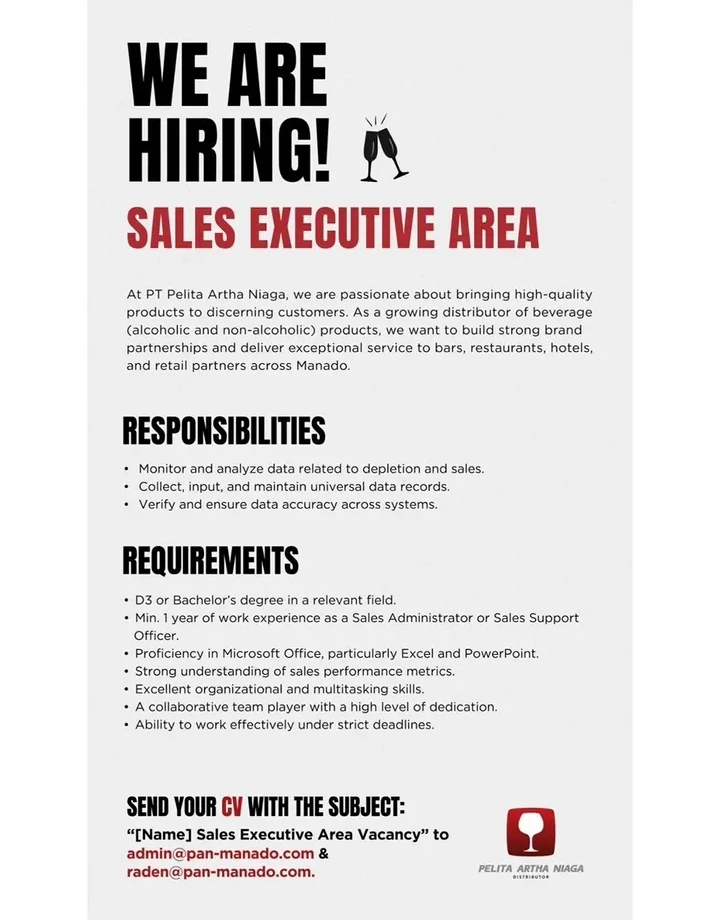 Apakah Anda seorang profesional di bidang penjualan dengan kemampuan analisis data yang tajam? PT Pelita Artha Niaga, distributor terkemuka produk minuman (alkohol dan non-alkohol), sedang membuka kesempatan karir bagi Anda untuk mengisi posisi Sales Executive Area di wilayah Manado.