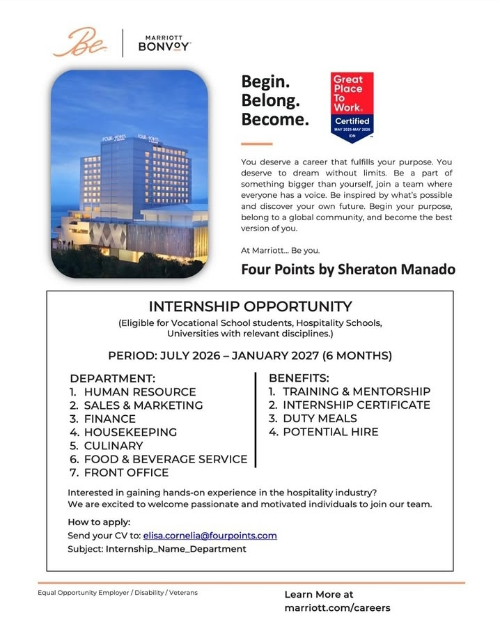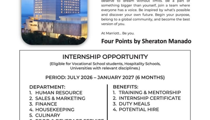 Apakah Anda mahasiswa atau siswa sekolah perhotelan yang sedang mencari tempat magang profesional? Four Points by Sheraton Manado, bagian dari jaringan global Marriott Bonvoy, secara resmi membuka Internship Opportunity untuk periode Juli 2026 – Januari 2027.