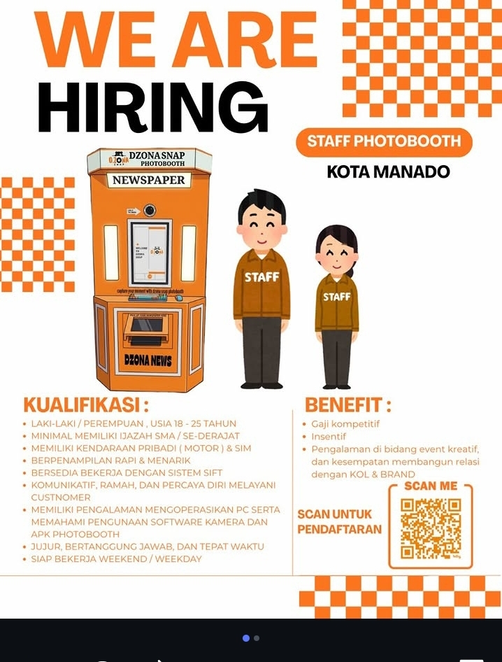 Apakah Anda anak muda yang komunikatif, suka dunia kreatif, dan sedang mencari tantangan baru? Dzona Snap Photobooth kini sedang membuka kesempatan karier untuk posisi Staff Photobooth di Kota Manado.