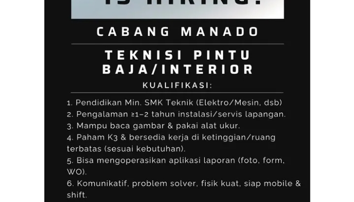 Jika Anda memiliki latar belakang teknik dan menyukai tantangan kerja lapangan, ini adalah peluang tepat untuk bergabung dengan pemimpin pasar di industri pintu baja Indonesia.