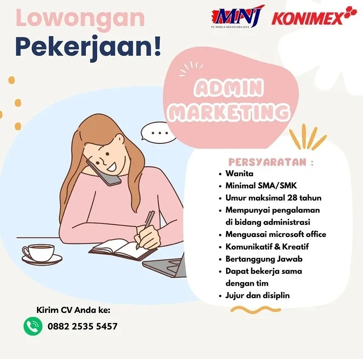 Apakah Anda pribadi yang detail, komunikatif, dan mahir dalam administrasi? PT. Marga Nusantara Jaya, distributor utama dari produk-produk Konimex, sedang membuka kesempatan karir bagi talenta muda untuk mengisi posisi Admin Marketing.