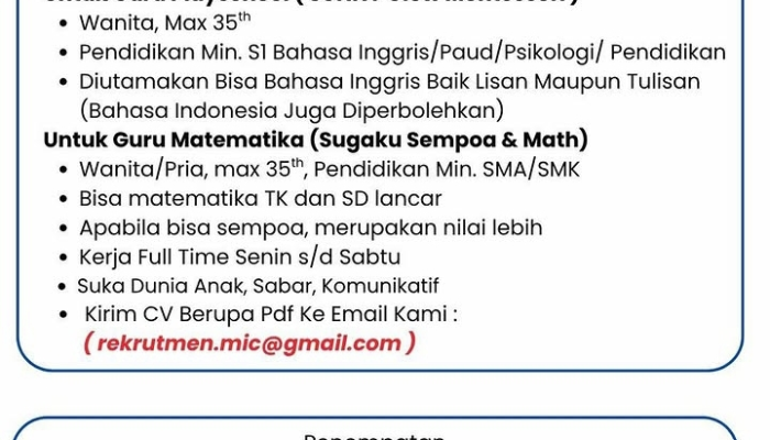 - Pendidikan: Minimal S1 Bahasa Inggris / PAUD / Psikologi / Pendidikan.