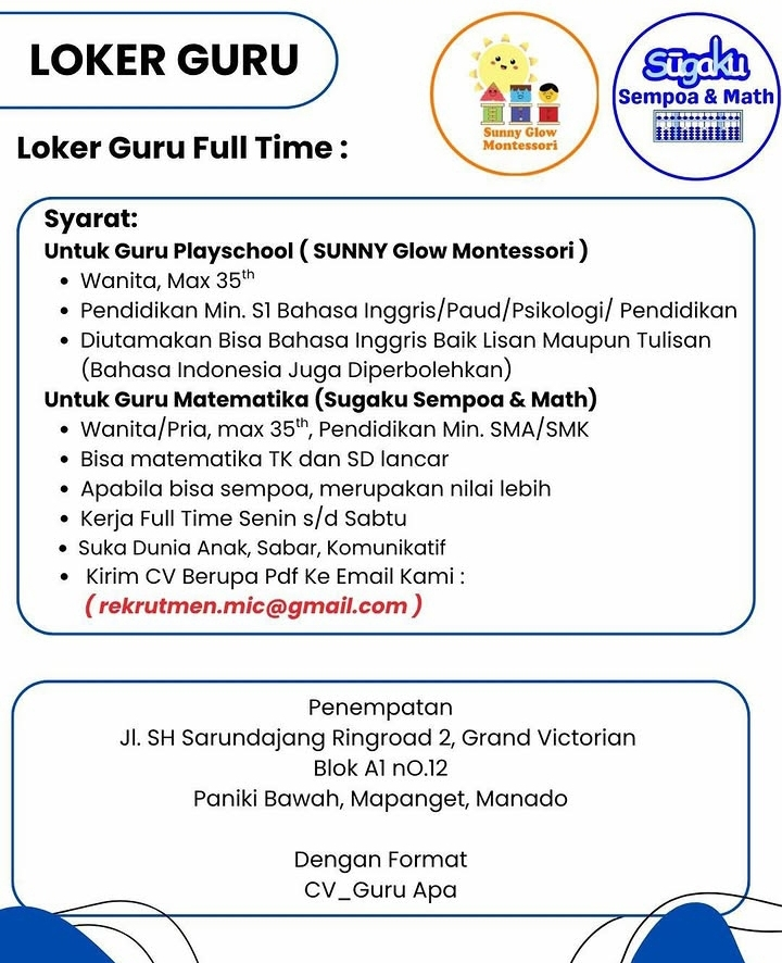 Apakah Anda memiliki passion dalam dunia pendidikan dan mencintai dunia anak-anak? Saat ini, Sunny Glow Montessori dan Sugaku Sempoa & Math sedang membuka kesempatan karir bagi Anda untuk bergabung sebagai Guru Full Time untuk penempatan di wilayah Manado.