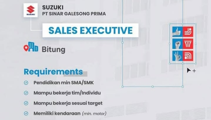 Apakah Anda pribadi yang komunikatif, kompetitif, dan memiliki minat besar di industri otomotif? PT Sinar Galesong Prima, diler resmi mobil Suzuki, sedang membuka kesempatan karir bagi Anda untuk bergabung sebagai Sales Executive untuk penempatan wilayah Bitung dan sekitarnya.