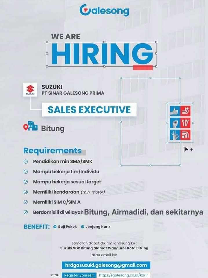 hrdgasuzuki.galesong@gmail.com - Pendaftaran Online: Registrasi melalui website resmi di: https://galesong.co.id/karir