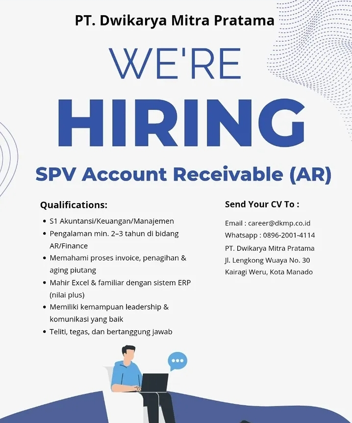 PT Dwikarya Mitra Pratama sedang membuka kesempatan karir bagi tenaga profesional di bidang keuangan untuk bergabung sebagai SPV Account Receivable (AR). Posisi ini diperuntukkan bagi Anda yang memiliki kemampuan kepemimpinan yang kuat dan ketelitian tinggi dalam mengelola manajemen piutang perusahaan.