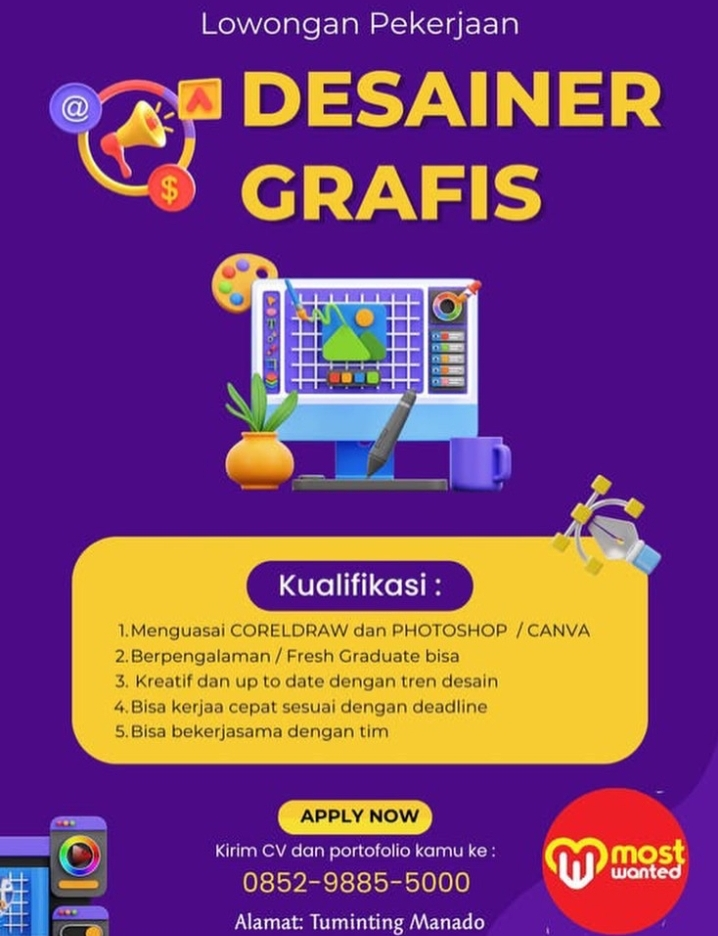 Apakah Anda seorang kreatif yang mahir dalam mengolah visual? Most Wanted, unit usaha yang berbasis di Tuminting, Manado, sedang membuka kesempatan karier bagi Anda untuk bergabung sebagai Desainer Grafis.