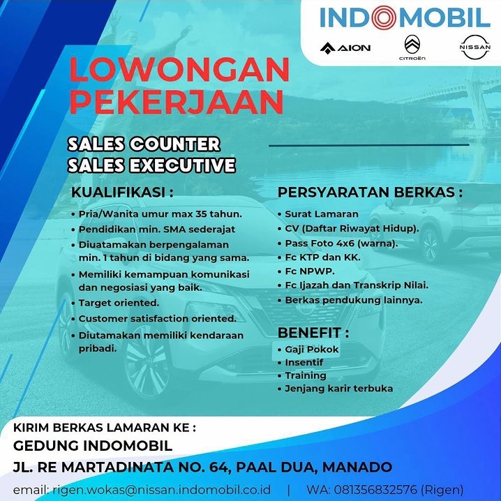 Apakah Anda memiliki minat besar di dunia otomotif dan ingin berkarier di perusahaan berskala nasional? Indomobil Group kembali membuka kesempatan berkarier di Manado untuk brand-brand otomotif ternama seperti Aion, Citroën, dan Nissan.