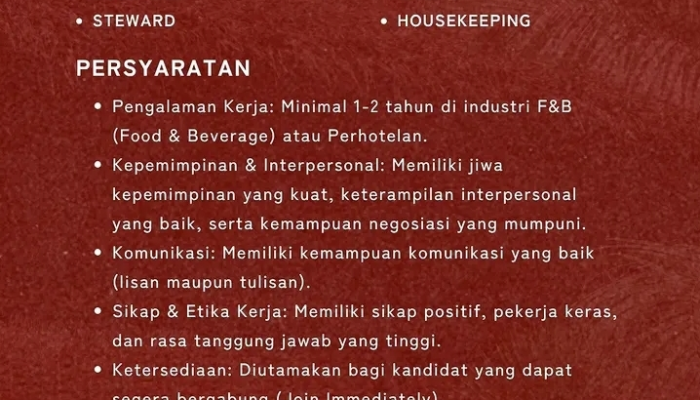 - Pengalaman Kerja: Minimal 1-2 tahun pengalaman di industri Food & Beverage (F&B) atau Perhotelan.