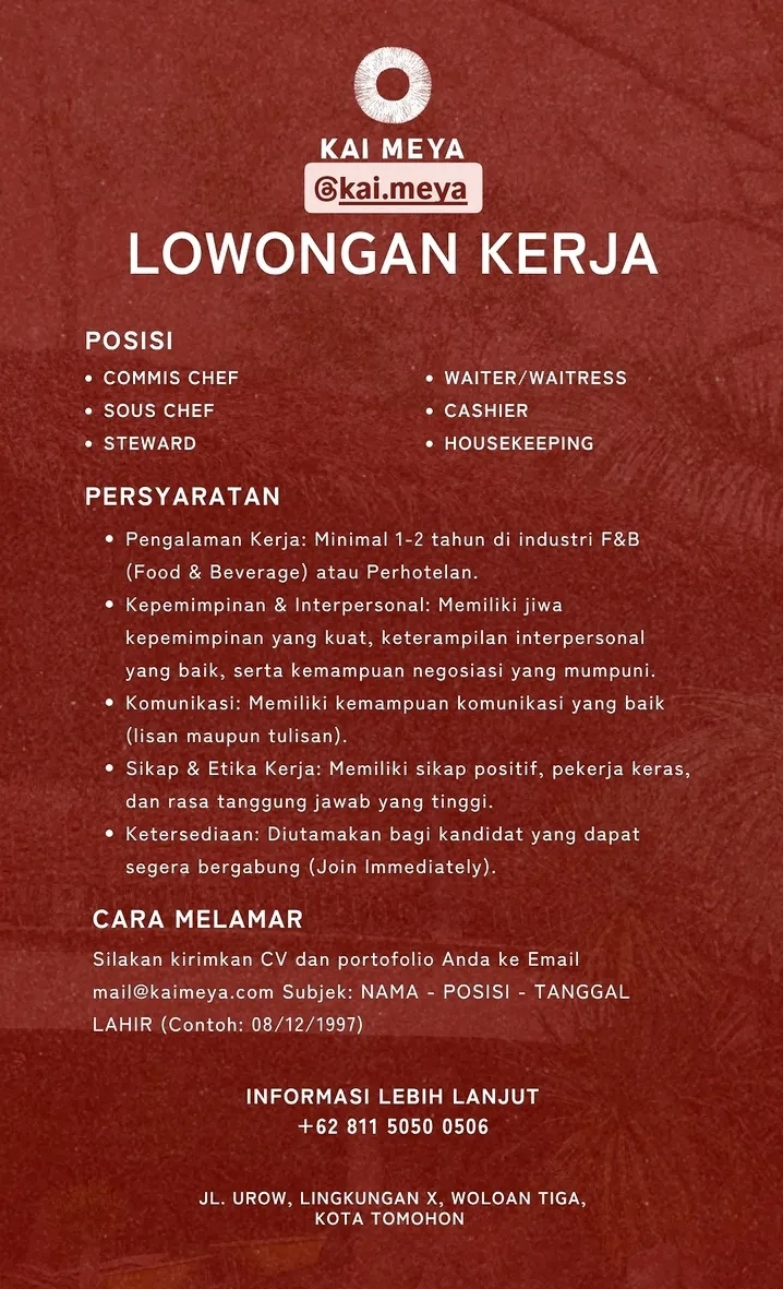 Apakah Anda seorang profesional di bidang kuliner atau perhotelan yang sedang mencari tantangan baru? Kai Meya, destinasi populer di Kota Tomohon, sedang membuka kesempatan karier bagi individu-individu dinamis dan bersemangat untuk bergabung dengan tim kami.