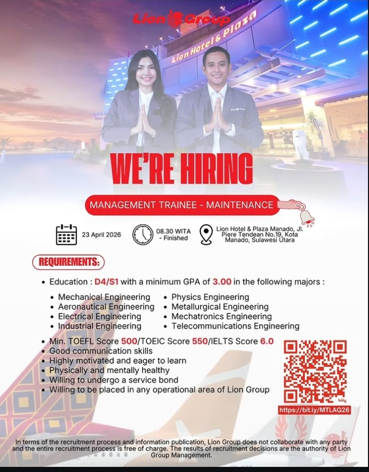 Apakah Anda seorang lulusan teknik yang ingin membangun karier di industri penerbangan berskala nasional? Lion Group membuka peluang emas melalui program Management Trainee (MT) – Maintenance. Program ini merupakan jalur khusus bagi para profesional muda berbakat untuk menjadi tenaga ahli di bidang perawatan dan pemeliharaan armada Lion Group.