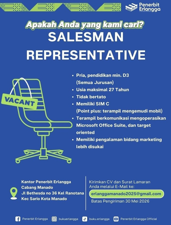 Apakah Anda pribadi yang komunikatif, berorientasi pada target, dan ingin membangun karier di industri penerbitan nasional? Penerbit Erlangga, salah satu penerbit buku pendidikan terbesar di Indonesia, sedang membuka kesempatan bagi Anda untuk bergabung sebagai Salesman Representative untuk wilayah penempatan Manado.
