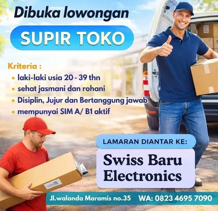 Swiss Baru Electronics, salah satu pusat elektronik terpercaya, saat ini sedang mencari tenaga kerja yang berdedikasi untuk bergabung sebagai Supir Toko. Jika Anda adalah pribadi yang disiplin, bertanggung jawab, dan memiliki kemampuan mengemudi yang baik, ini adalah kesempatan Anda untuk berkarir bersama kami.