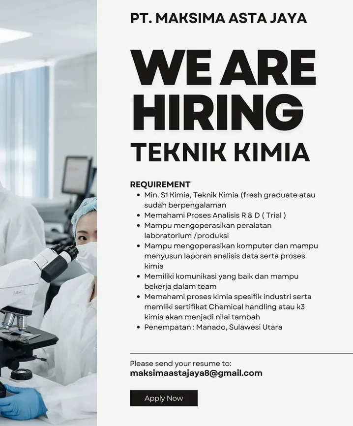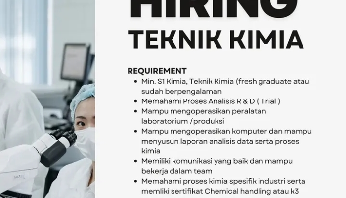 - Pendidikan: Minimal S1 Kimia atau Teknik Kimia (Terbuka untuk Fresh Graduate maupun yang sudah berpengalaman).
