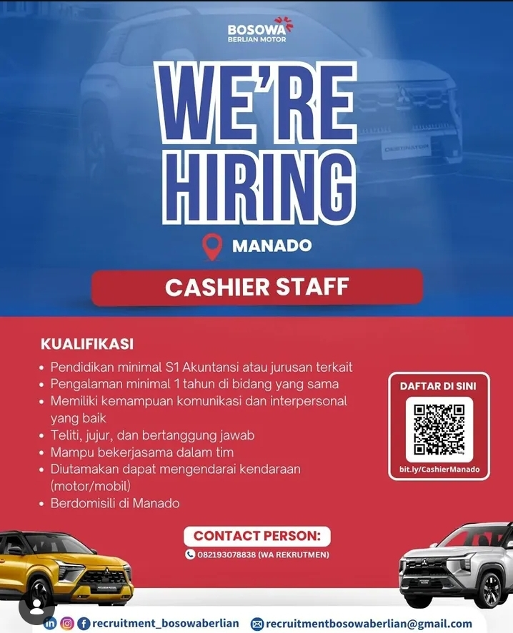 Bosowa Berlian Motor, dealer resmi Mitsubishi yang terpercaya, saat ini sedang membuka kesempatan karir bagi tenaga profesional di Sulawesi Utara. Kami mencari kandidat yang teliti dan berintegritas untuk mengisi posisi sebagai Cashier Staff penempatan kantor cabang Manado.