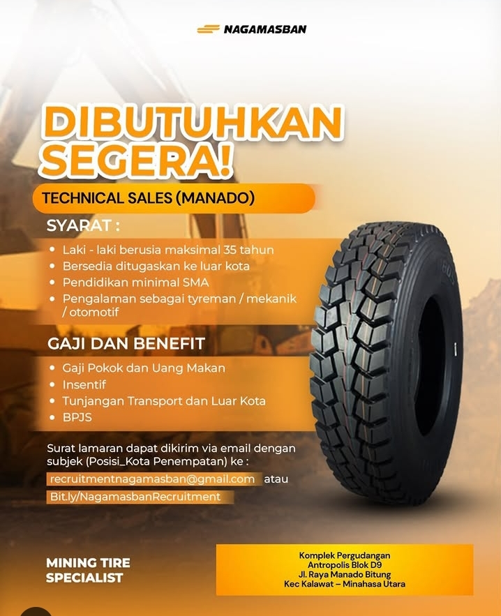 Nagamasban, perusahaan yang bergerak sebagai Mining Tire Specialist, saat ini sedang mencari tenaga profesional yang dinamis dan berorientasi pada target untuk mengisi posisi Technical Sales penempatan Manado.
