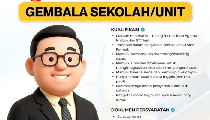 Jika Anda memiliki latar belakang pendidikan Teologi dan rindu untuk membimbing generasi muda di lingkungan sekolah formal, inilah kesempatan Anda untuk bergabung bersama kami di Manado.