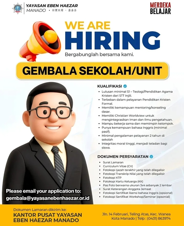 Yayasan Eben Haezar Manado saat ini sedang membuka kesempatan karir bagi Anda yang terpanggil dalam pelayanan pendidikan Kristen. Kami mencari individu yang berintegritas dan memiliki visi spiritual yang kuat untuk mengisi posisi sebagai Gembala Sekolah/Unit.