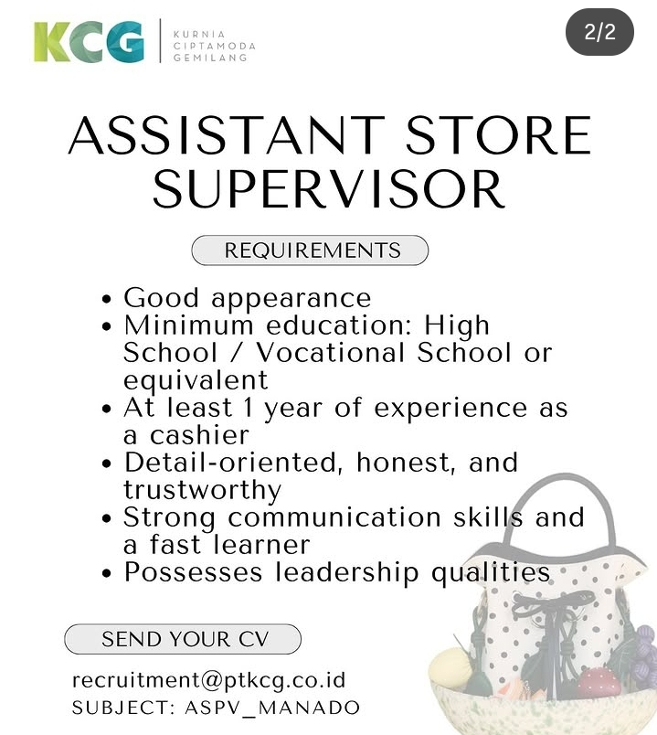 Apakah Anda seorang profesional di bidang retail yang memiliki jiwa kepemimpinan dan ketelitian tinggi? PT Kurnia Ciptamoda Gemilang (KCG), perusahaan yang bergerak di bidang retail fashion dan gaya hidup terkemuka, kini memberikan kesempatan bagi Anda untuk mengembangkan karier sebagai Assistant Store Supervisor untuk wilayah Manado.