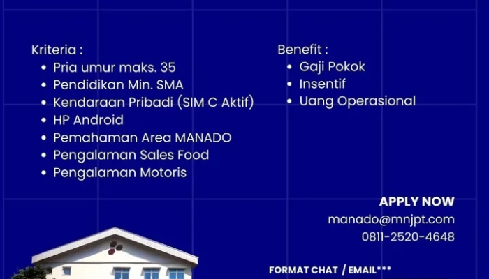 - Pengalaman: Diutamakan memiliki pengalaman sebagai Sales Food dan pengalaman sebagai Motoris.