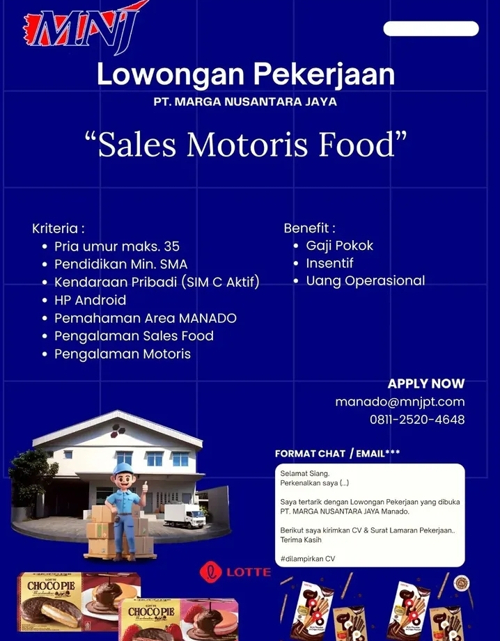 Apakah Anda seorang tenaga penjual yang dinamis dan mengenal area Manado dengan baik? PT Marga Nusantara Jaya (MNJ), distributor terkemuka untuk produk consumer goods (termasuk brand Lotte), sedang membuka kesempatan karier untuk posisi Sales Motoris Food.