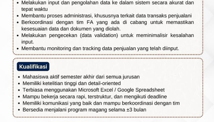 - Terbiasa mengoperasikan Microsoft Excel atau Google Spreadsheet.