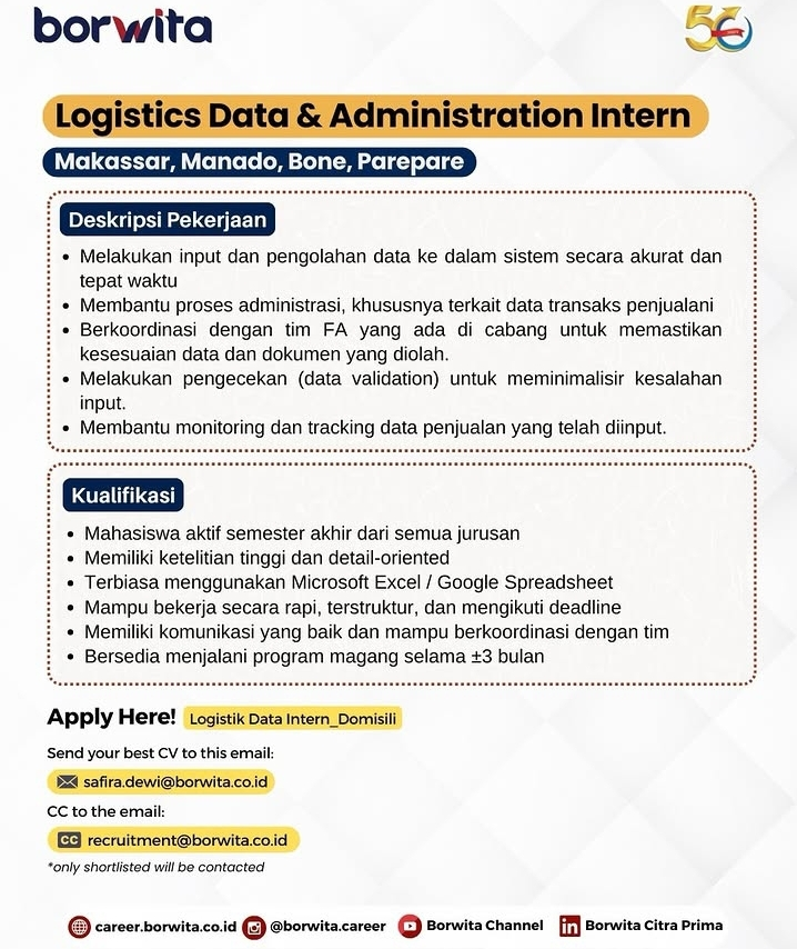 Apakah Anda mahasiswa tingkat akhir yang ingin merasakan pengalaman kerja nyata di perusahaan distribusi terkemuka? Borwita sedang membuka kesempatan bagi talenta muda untuk bergabung dalam program Logistics Data & Administration Intern.